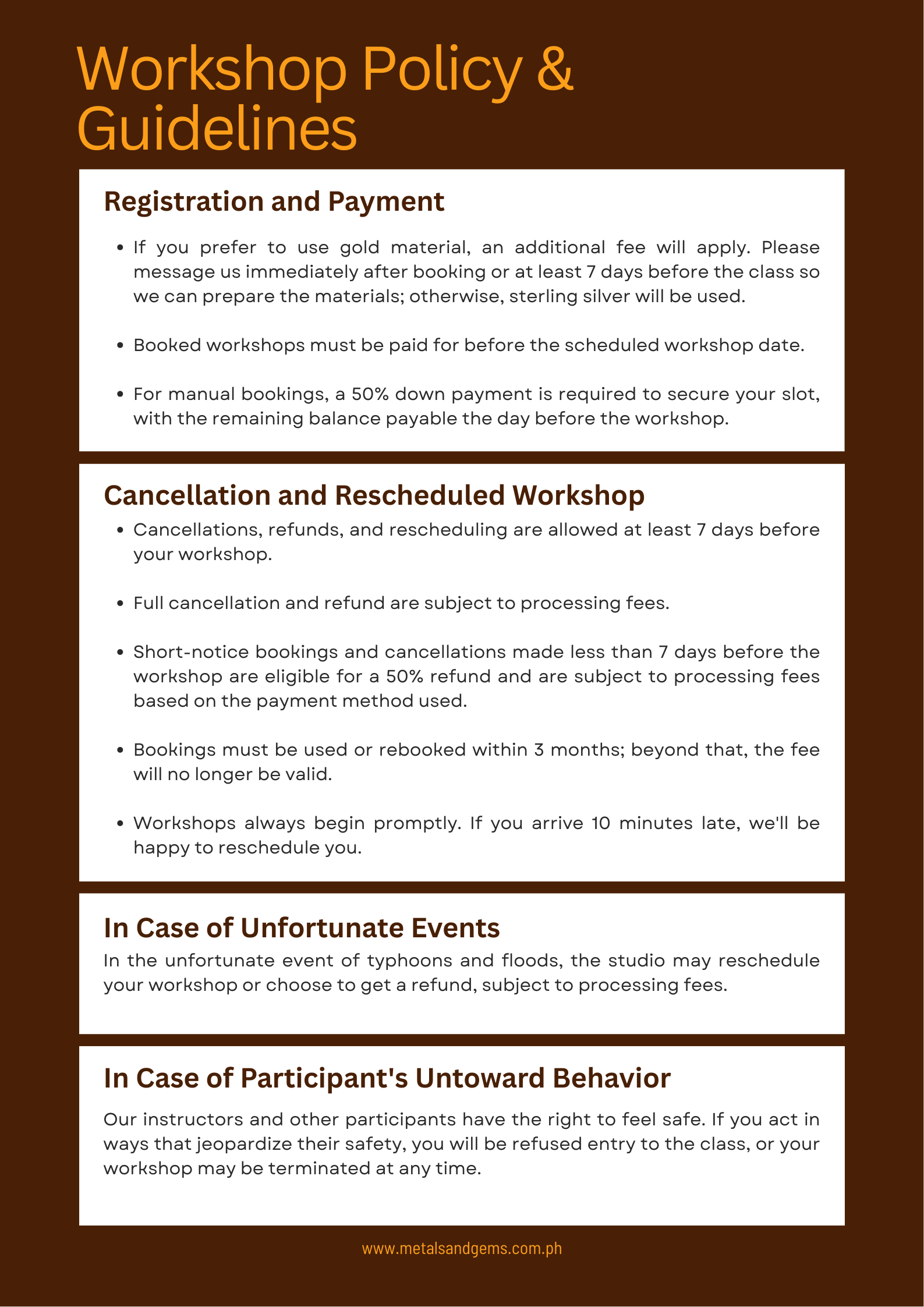 - In the unfortunate event of typhoons and floods, you may reschedule your workshop or choose to get a refund.